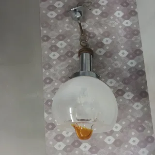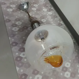 Lampada a sospensione con un design elegante che unisce il bianco del vetro opalino alla sfumatura ambra tipico degli anni 70, lampadario vero vintage e NON riproduzione recente, lo stile è quello Mazzega, prestigioso marchio italiano dallo stile inconfondibile e molto apprezzato in tutto il mondo, la coppa ed il telaio sono in metallo lucido con qualche segno del tempo mentre la cupola in vetro opalino è in ottimo stato e senza alcun danno Le foto sono parte integrante della descrizione Verrà accuratamente imballato con impiego di materiali idonei per le spedizioni come pluriball e polistirolo che garantiscono l'integrità
