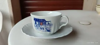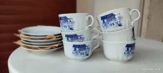 Elegante set di sei tazze in porcellana con una delicata decorazione. - Design con raffigurazioni di case su palafitte. - Manici comodi per una presa sicura. - Ideali per la colazione o una pausa tè.