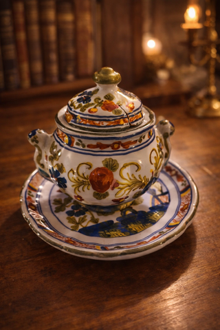 Deliziosa zuccheriera o terrina in ceramica, finemente decorata a mano con motivi floreali e dettagli colorati. - Pezzo unico dipinto a mano. - Design floreale vivace. Come visibile in foto, sono presenti piccoli difetti estetici che testimoniano l'originalità e l'epoca.