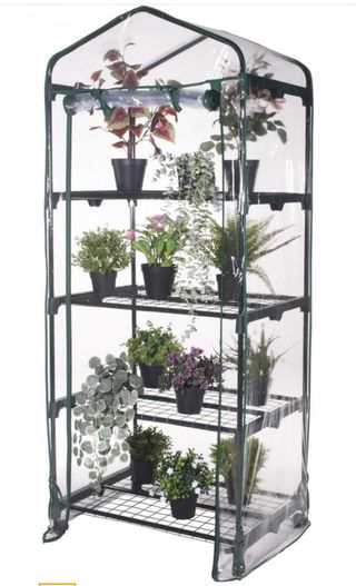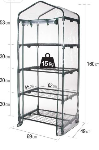 Serra a 4 ripiani, ideale per balconi e giardini. La struttura è pensata per proteggere le tue piante. - Quattro ripiani metallici. - Copertura trasparente in PVC. - Facile da montare e spostare.