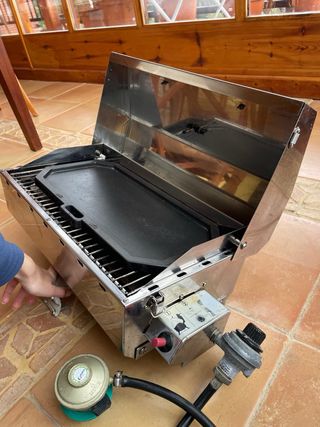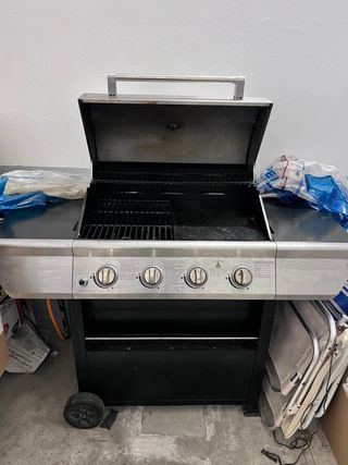 Barbacoa a gas Naterial in ottime condizioni, ideale per terrazzo o giardino. Dotato di 3 bruciatori, coperchio con termometro integrato, griglia ampia e carrello con ruote per spostarla facilmente. Accensione rapida e facile, riscalda uniformemente ed è perfetta sia per uso quotidiano che per riunioni. Include copertura protettiva per esterni, impermeabile, per mantenerla al riparo da sole, pioggia e polvere. Fornito con: tubo flessibile e regolatore, copertura per esterni, griglie e accessori visti in foto. Sempre ben curata e pulita dopo l'uso. Pronta all'uso. Venduto per poco utilizzo.