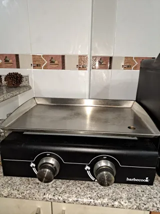 Griglia a gas del marchio Barbecook, ideale per cucinare all'aperto. Superficie di cottura metallica. Due bruciatori con controllo della temperatura. Accensione piezoelettrica.