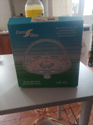 Fornello portatile della marca Com Gas, modello LC-15. Progettato per il collegamento diretto alle bombole di GPL (butano-propano). Con maniglia per facilitare il trasporto. Collegamento diretto alla bombola del gas.