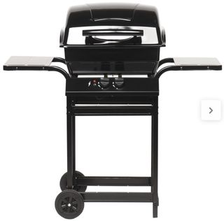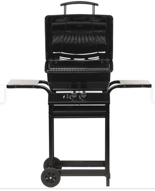Barbecue a gas con coperchio, pronto all'uso. Include bombola. Struttura principale in colore nero. Bombola del gas in colore arancione.