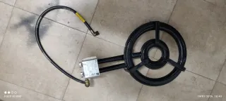 Fornello a gas con tubo flessibile di collegamento. - Bruciatore ad anello in metallo. - Tubo flessibile in gomma arancione.