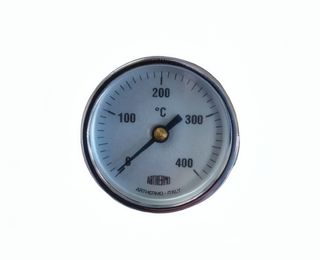 Termometro analogico per forno a legna. Mostra la temperatura in gradi Celsius. Gamma di temperatura: 0-400 °C. Sfera chiara con marcature precise. Realizzato in metallo resistente.