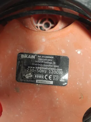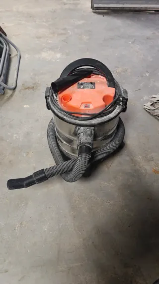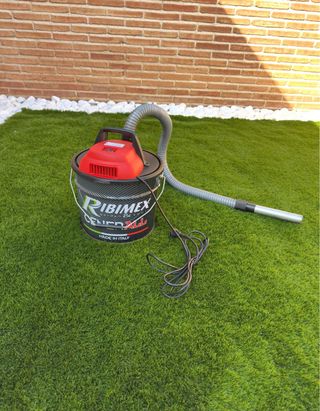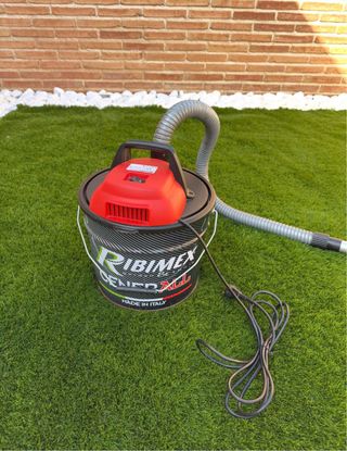 Aspiracenere marca Bikain. Per aspirare ceneri da stufe a legna, pellet e residui di carbone da barbecue. Corpo principale in metallo. Tubo flessibile in gomma. Maniglia superiore in plastica per il trasporto.