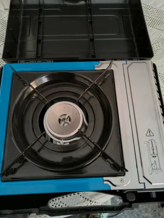 Cucina portatile della marca Campingaz. Ideale per il campeggio o le escursioni. Design compatto e leggero. Accensione piezoelettrica integrata. Controllo della fiamma regolabile.