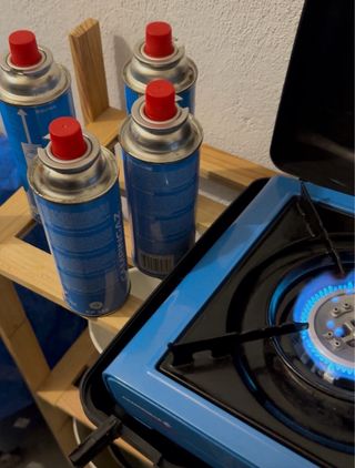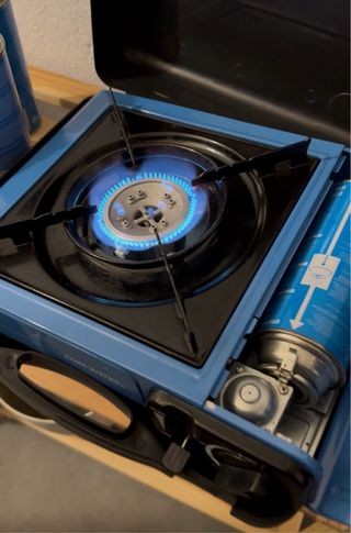 Fornello portatile per campeggio con bombola di gas. Design compatto e facile da trasportare. Bombola di gas blu. Supporto metallico per utensili da cucina.