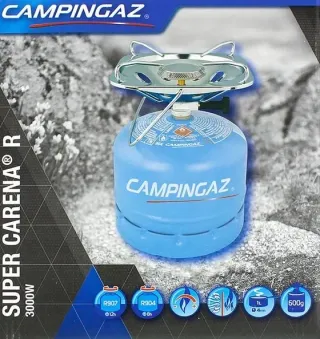 Fornello Campingaz Super Carena R 33792 da campeggio per cucinare. Funziona con bombole di gas per campeggio, Butsir,..... Per bombola 907, 904 e 901 AZZURRO (non inclusa). Si avvita direttamente alla bombola. Peso 730 grammi. Prodotto nuovo. Include cartuccia R907 (12h) e R904 (8h). Indicatore del livello del carburante. Capacità 1L con 4 minuti di autonomia. Peso 600g.