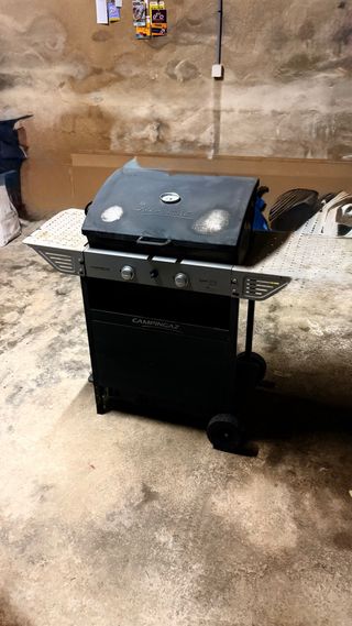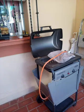 Barbacoa a gas Campingaz con finitura in metallo e plastica. - Coperchio con finitura marrone e nero. - Pannello di controllo con comandi. - Porte inferiori color beige. Ha un po' di ruggine sul coperchio ma per il resto funziona perfettamente e la lascio a un prezzo basso, il prezzo NON È TRATTABILE