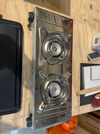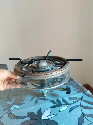 Fornello portatile a due fuochi della marca Campingaz. Include una bombola di gas vuota. Design compatto e pieghevole. Due bruciatori. Piedini in plastica per maggiore stabilità. In buone condizioni. Prezzo 25€.