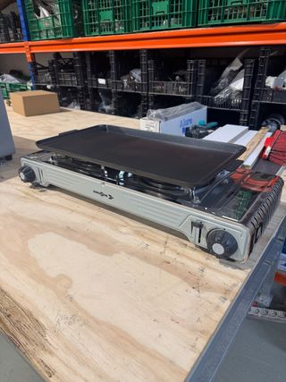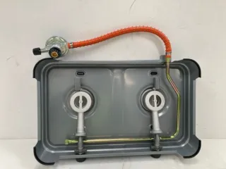 Placa di butano a due fuochi, ideale per il campeggio o attività all'aperto. Il suo design compatto la rende facile da trasportare. - Due bruciatori. - Accensione manuale.