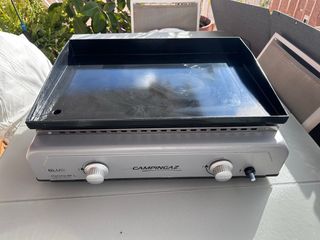 Piastra a gas Campingaz modello Blue Flame L. Progettata in Francia. Accensione piezoelettrica. Controllo della temperatura regolabile. Dimensioni totali reali 65x50x20. Piastra di cottura 62x41x6 fondo, 2