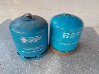 In vendita due bottiglie di gas per campeggio. Colore blu. Realizzate in metallo e plastica.
