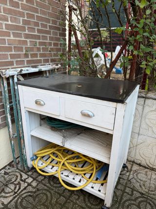 Tavolo ausiliario versatile, ideale da posizionare accanto al barbecue o come superficie di lavoro aggiuntiva all'aperto. Il suo design funzionale lo rende pratico per qualsiasi spazio all'aperto. Dimensioni: Larghezza: 92 cm, Profondità: 62 cm, Altezza del marmo: 2,02 cm, Altezza totale del tavolo (con gambe): 96 cm. Piano in nero, struttura principale in bianco, ruote per facilitarne la mobilità.