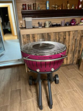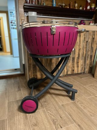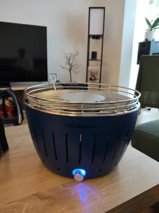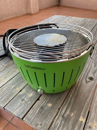 Grill Lotus portatile, ideale per barbecue senza fumo. Il suo design permette un montaggio e smontaggio rapido. Griglia in acciaio inossidabile, 34 cm di diametro, con ventilatore regolabile per controllare il fuoco. Include un disco centrale per il carbone. Usato solo 2 volte. Funziona perfettamente. Vendiamo perché abbiamo acquistato uno più grande.
