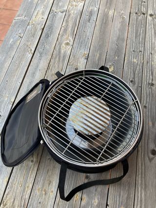 Barbacoa portatile progettata per essere compatta e facile da trasportare. Usata 4 volte. Include griglia e secchio per carbone. Struttura metallica resistente. Funziona solo con modalità ventilatore a batteria.