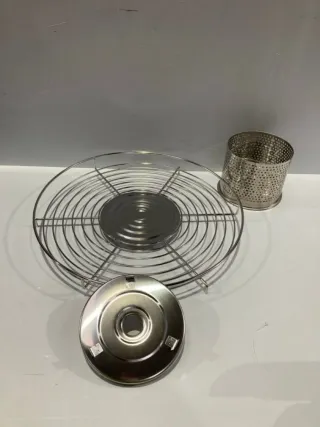 Griglia a sospensione dal design senza fumo, ideale per l'uso in interni o esterni. La sua struttura permette una cottura uniforme ed efficiente. Realizzata in metallo e legno, colore argento. Completamente nuova, mai utilizzata.