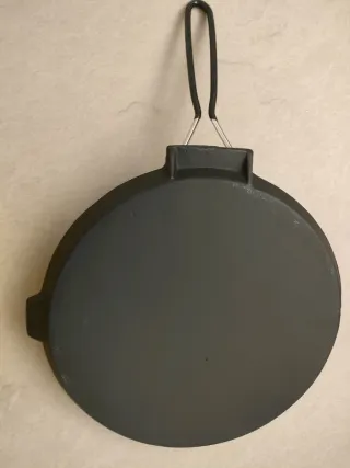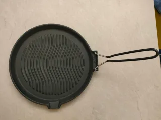 Griglia in ghisa con manico. - Superficie rigata per una cottura uniforme. - Design rotondo e compatto. - Circonferenza 27 cm.