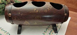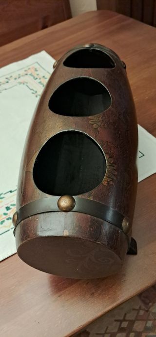Oggetto in legno e borchie con decorazioni dipinte. Possono essere riposte 3 bottiglie di vino.