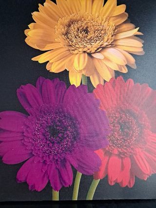 Quadro in canvas fondo nero e tre gerbere colorate. Cornice in legno. Misure 35x35 con gancio per appenderlo.