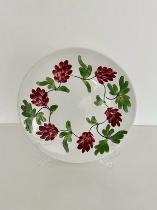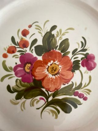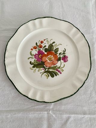 piatto piano dipinto a mano in ceramica Fontebasso, diametro cm 23,8. Vintage in condizioni più che buone, mai utilizzato. Colori brillanti e ceramica lucentissima. Decorato come i famosi Mondovì di Richard Ginori.