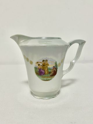Lattiera in fine porcellana Richard Ginori a sfondo bianco con riflessi cangianti grigio/verdolino e decalcomania centrale. Larghezza da beccuccio a manico 12 cm, altezza 10 cm. Vintage anni 40 in condizioni più che buone, un minuscolo puntino nero vicino al manico, porcellana lucentissima.