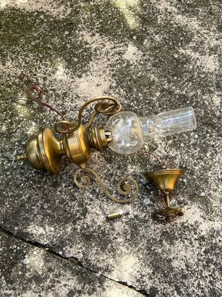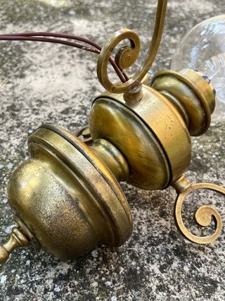 Vendo Lampadario in ottone vintage, nello stato in cui si trova . Pezzo unico. Potrebbe mancare qualche componente. - Struttura in metallo dorato. - Dettagli in vetro trasparente. - Design elegante con riccioli decorativi