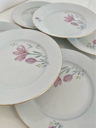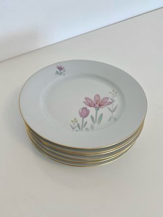 Elegante set di sei piatti da dessert con un diametro di 19,5 cm, decorati con un delicato motivo floreale. - Design floreale con fiori rosa e tocchi di verde. - Bordo dorato che aggiunge un tocco di raffinatezza. - Ideali per servire dessert o antipasti con stile. Vintage in condizioni molto buone, nessuna sbeccatura, qualche minuscolo graffietto.
