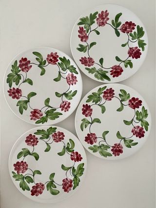Bellissimo set di quattro piatti in ceramica, perfetti per aggiungere un tocco di colore alla tua tavola. Ogni piatto è decorato a mano con un motivo floreale. - Diametro: 23,8 cm - Decorazione floreale dipinta a mano - Marca: Fontebasso Vintage in condizioni più che buone, mai utilizzati. Colori brillanti e ceramica lucentissima. Decorati come i famosi Mondovì di Richard Ginori. Stupendi