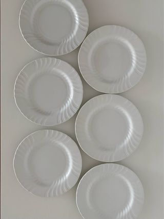 Elegante set di 6 piatti da dessert Fontebasso Treviso, perfetti per ogni occasione. Vintage mai utilizzati, in condizioni più che buone, ceramica molto lucente. - Diametro: 19,8 cm - Design raffinato con motivo a onde.