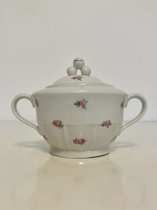 Bellissima zuccheriera in porcellana Richard Ginori anni 30 con raffinato decoro a motivo roselline. Diametro esterno superiore cm 10, altezza con coperchio cm 9,5, larghezza con manici cm 13,5. Richard Ginori timbro verde d’epoca, in condizioni molto buone considerata l’età. Nessuna incrinatura né sbeccatura, un puntino scuro all’interno come evidenziato nell’ultima foto.