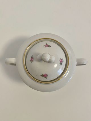 set - Teiera (altezza 19 cm con coperchio, larghezza 25 cm) e - zuccheriera diametro 9 cm, altezza 11 cm) in fine porcellana Bavaria con filo oro. Vintage anni 60 in condizioni molto buone