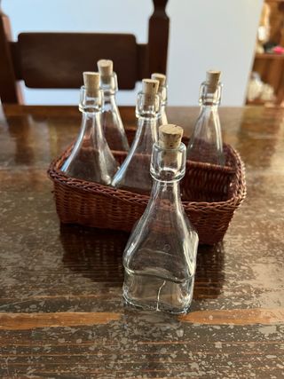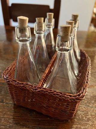 Set di sei piccole bottiglie con tappo in sughero, perfette per conservare e servire aromi o oli. - Realizzate in vetro trasparente. - Ogni bottiglia è dotata di un tappo in sughero. - Presentate in un cestino in vimini marrone.