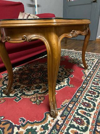Tavolino intarsiato eseguito a mano da mobiliere saluzzese stile barocco Con vetro tagliato su misura Misure: Altezza cm 52.5 Lunghezza cm 72 Larghezza cm 40