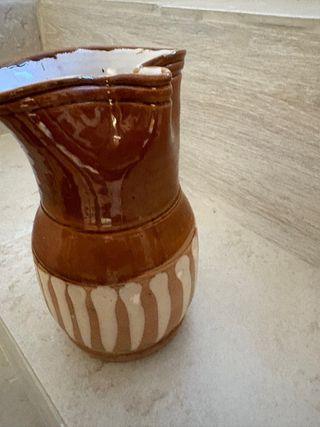Antica brocca in ceramica pugliese, un pezzo unico. - Finitura lucida marrone. - Base decorata con motivi a righe verticali. - Manico robusto e beccuccio sagomato.