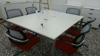 Tavolo riunioni dimensioni cm L160xP125xH73. Come nuovo. Struttura in metallica, finitura bianca. Piano di lavoro fornito di ampio TopAccess rettangolare. Finitura piano bianco. Il tavolo è completo di 6 sedie moderne. - Tavolo con dimensioni L160xP125 cm. - Sedie con seduta e schienale imbottiti. - Struttura delle sedie in metallo cromato.
