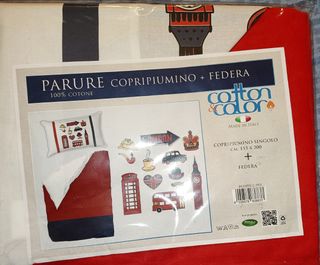 Copripiumino per letto singolo 155x200 cm completo di federa 50x80 colore rosso, blu e bianco cotone 100% colori dell'Inghilterra. La federa è a fantasia con i simboli tipici dell'Inghilterra. Nuovo, mai aperto. Prezzo fisso