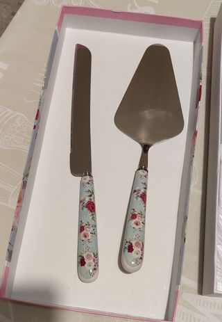 Elegante set composto da coltello e spatola per torte, con manici decorati con un motivo floreale. - Manici in plastica con fantasia floreale. - Lame in acciaio