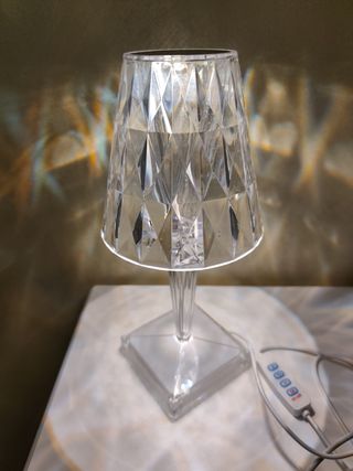 Elegante lampada da tavolo con un design moderno e raffinato. - Materiale: plastica e vetro. - Colore: trasparente. - Effetto luce decorativo con diverse tonalita di colore