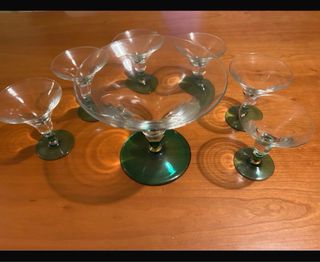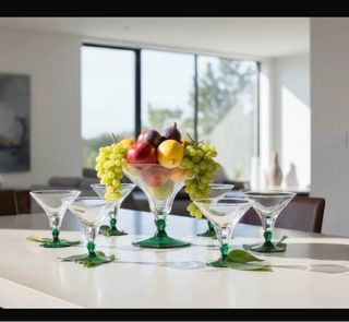 Elegante servizio composto da una coppa centrale e sei calici. - Design raffinato con dettagli verdi e oro - Realizzati in vetro trasparente. - spediti in sicurezza e protezione