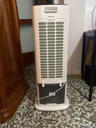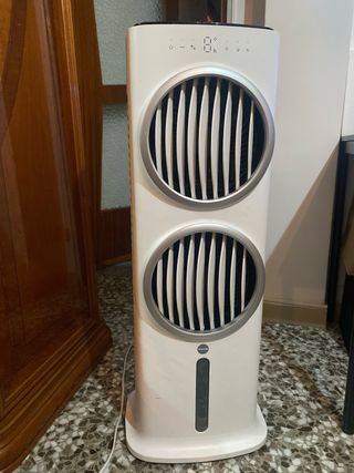 Raffrescatore evaporativo dal design moderno, con finitura bianca e dettagli grigi. - Due griglie circolari frontali. - Indicatore di livello dell'acqua trasparente. - Pannello comandi digitale superiore.