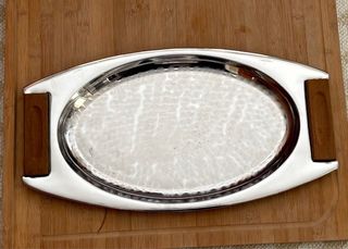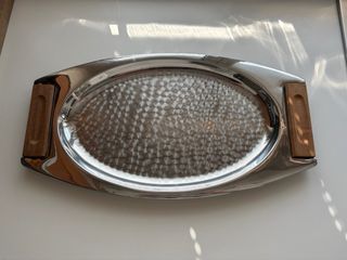 Elegante vassoio ovale con finitura martellata e pratici manici in legno. - Design moderno e raffinato. - Superficie interna lavorata. - Manici in legno per una presa comoda.