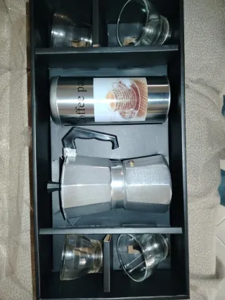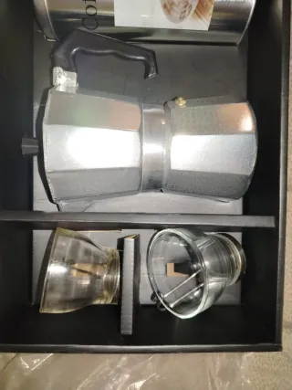 Set per la preparazione del caffè. - Moka in metallo. - Bicchieri in vetro trasparente.