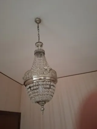 Elegante lampadario vintage originale, con finiture in metallo e dettagli in cristallo. - Struttura in metallo color argento. - Pendenti in cristallo trasparente.