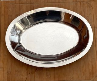 Vassoio in acciaio inox 18/10 di forma ovale ideale per la gastronomia. Il suo bordo è a fascia larga, rialzato in modo da essere contenitivo permette di esporre prodotti con sughi, risotti, paella, insalate fredde di farro, riso integrale ecc. - Finitura lucida e resistente. - Design ovale classico. - Materiale durevole e facile da pulire.
