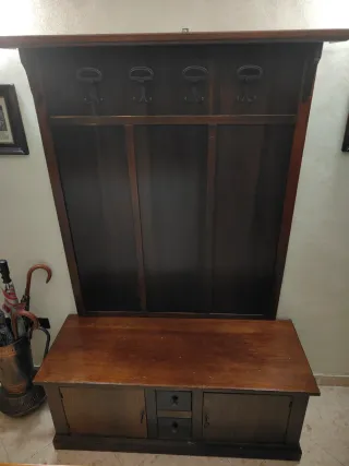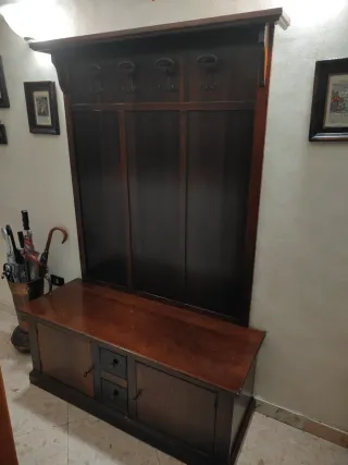 Mobile da ingresso in stile arte povera, perfetto per organizzare i tuoi oggetti. - Realizzato in legno. - Colore marrone scuro. - Dotato di ganci appendiabiti. - Presenta un vano contenitore con ante e cassetti. Vendo anche i due pezzi separatamente Ritiro presso domicilio venditore sito in Bari
