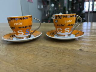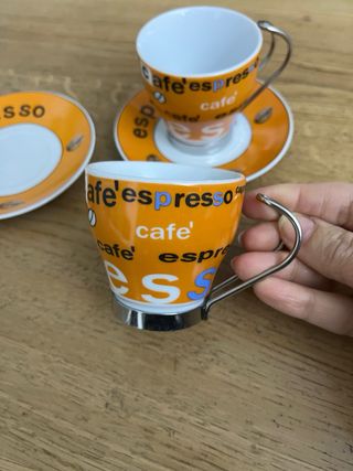 Set di due tazzine da caffè con piattini, perfette per gustare un espresso. - Design vivace con scritte espresso e cafe'. - Manici in metallo argentato. - Piattini coordinati con dettagli a tema caffè.
