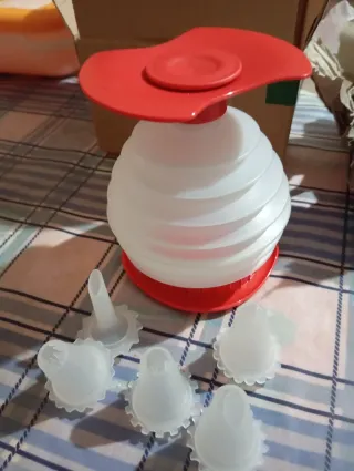 Set per decorare dolci e salai con 5 vari beccucci. - Pallina in plastica con finitura a spirale. - Coperchio rosso. - beccuccidi diverse forme.con tappino di chiusura per conservare o trasportare creme dolci o salate..le misure indicate sono a cartone di spedizione chiuso